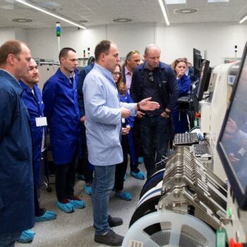 A o co chodziło z kaskami na zdjęciu po lewej stronie? Otóż były to kaski, które nosiliśmy podczas wizyty studyjnej w dobczyckim zakładzie ES-System. Przez zakład przewinęła się prawie setka gości w czterech grupach. Po fabryce oprowadzało nas trzech przewodników ze strony firmy: panowie Rafał Pilch, Marcin Perczyński i Jacek Woźniak. Dzięki nim wizyta była bardzo ciekawa; dowiedzieliśmy się, że produkcja oprawy oświetleniowej wcale nie jest tak prosta, jak by się zdawało! Przykładowo, do testów lamp morskich potrzebny jest specjalny tunel i mocny kombinezon ochronny… Przy okazji przedstawili świetną referencję systemu Infor LN i Infor Factory Track.