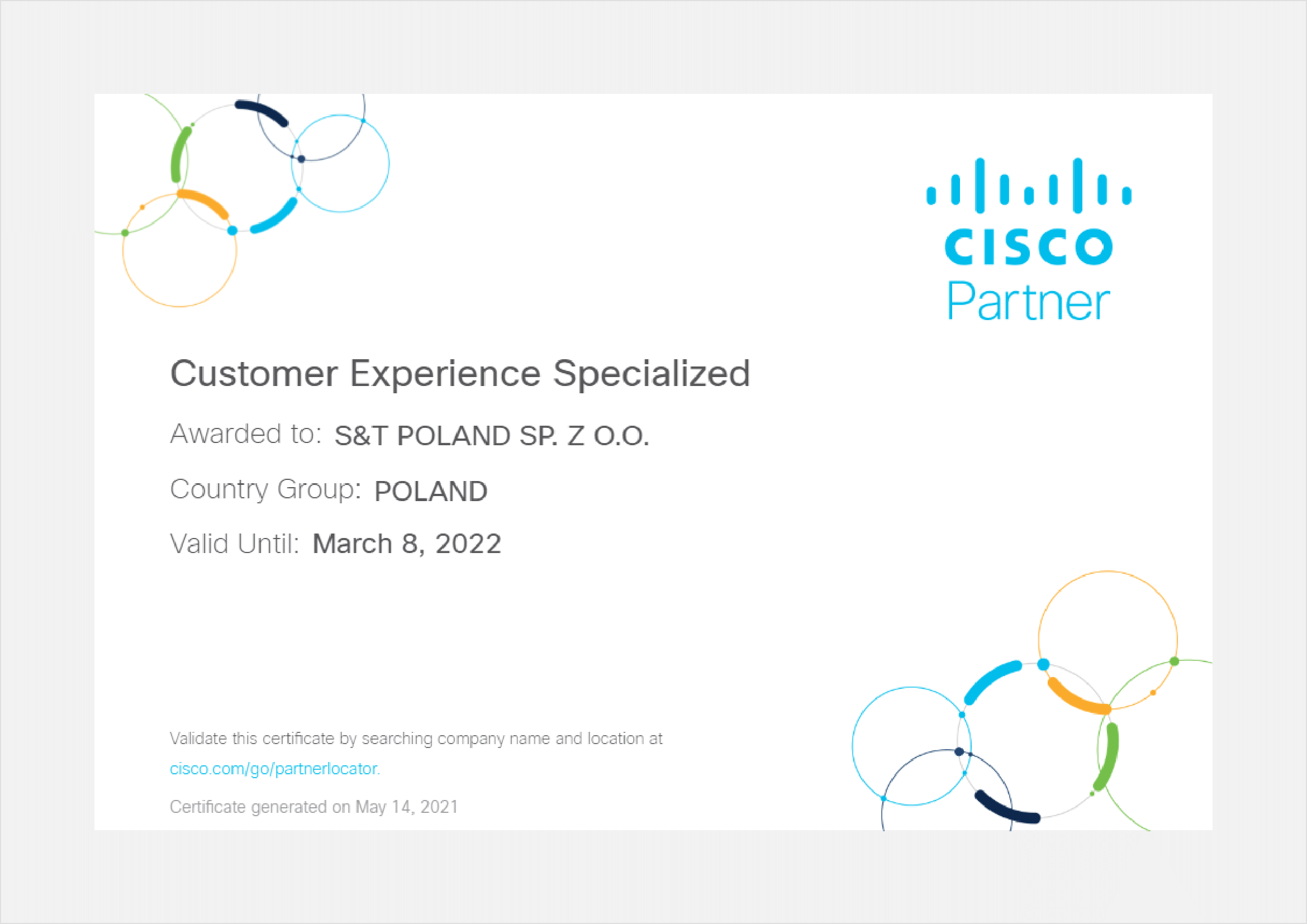 W marcu tego roku S&T, jako jedna z trzech pierwszych firm w Polsce, zostało wyróżnione certyfikatem Cisco Customer Experience. Potwierdza on, że zespół naszych konsultantów posiada niezbędną wiedzę, żeby towarzyszyć przedsiębiorstwom na każdym etapie cyklu użytkowania rozwiązań Cisco i wspierać je podczas eksplorowania określonych produktów, maksymalizując efektywność korzystania z nich.