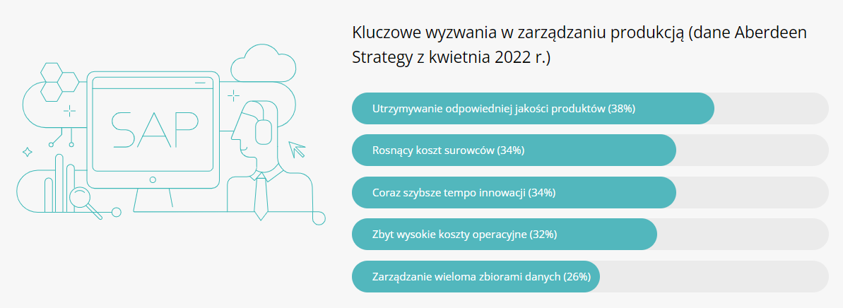 Dane SAP pokazują, że trzema priorytetami firm z branży produkcyjnej, które uważają za najistotniejsze do zwiększenia efektywności procesów, jest przede wszystkim zwiększenie poziomu ich automatyzacji, ale także usprawnienie kontroli kosztów i wydatków oraz zwiększenie ich przyjazności wobec środowiska naturalnego. Co za tym idzie, na czele najważniejszych dla nich technologii plasuje się chmura obliczeniowa.
