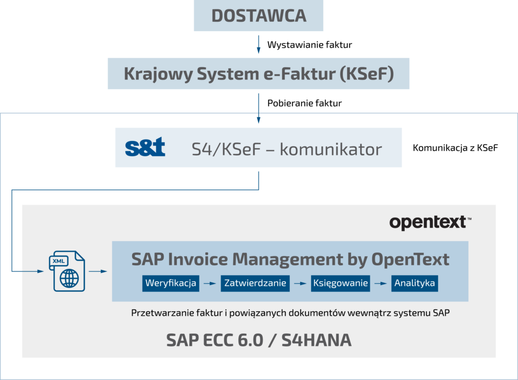 Komponentem, który odpowiada za wszelkie aspekty komunikacyjne z centralnym KSeF jest moduł do komunikacji S4/KSeF. W przypadku faktur zakupowych moduł ten udostępnia fakturę w postaci XML pobraną z KSeF i inicjuje jej dalsze, opisane powyżej, przetwarzanie wewnątrz systemu SAP, również przy użyciu rozwiązania Invoice Managemant by OpenText. W przypadku faktur sprzedażowych przesyła dokumenty z SAP do KSeF i przekazuje nadany im numer z powrotem do systemu podatnika.