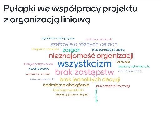 Efektem panelu – poza ciekawą dyskusją – były cztery chmury tagów, w których uczestnicy oraz słuchacze podawali własne odpowiedzi na kluczowe pytania zadane w trakcie rozmowy. „Co powinien wiedzieć lub znać zespół projektowy?” – na to pytanie najczęstszą odpowiedzią był „cel”. Rzeczywiście, jeśli każdy cel projektu rozumie inaczej, po swojemu, to prędzej czy później doprowadzi to do zmierzania działań w niewłaściwym kierunku. „Na co przede wszystkim powinien uważać kierownik projektu?” – tutaj w większości odpowiedzi przeważały nie twarde elementy projektu, takie jak harmonogram czy zakres, ale czynniki ludzkie. Jeśli nie zadba się o zespół, o dobrą komunikację i o utrzymanie motywacji, to problemy wywołane takim stanem rzeczy szybko wpłyną na pozostałe aspekty projektu. „Jakie są pułapki we współpracy projektu z organizacją liniową?” – tutaj ciekawym hasłem był „wszystkoizm”, który można w skrócie opisać jako rozrywanie się między zwykłymi obowiązkami w ramach swojego stanowiska pracy (w ramach organizacji liniowej) a między zadaniami narzucanymi przez projekt. I wreszcie najczęstszą odpowiedzią na pytanie: „Co trzeba mieć lub osiągnąć, aby projekty w firmie kończyły się sukcesem?” okazała się po prostu… chęć współpracy.